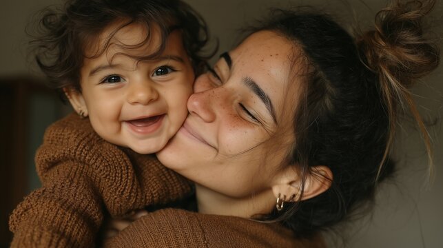 Headshot of mother and daughter are cuddling and smiling, enjoying a tender moment of affection and complicity