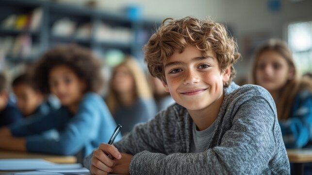 Smiling boy with curly hair writing in classroom.