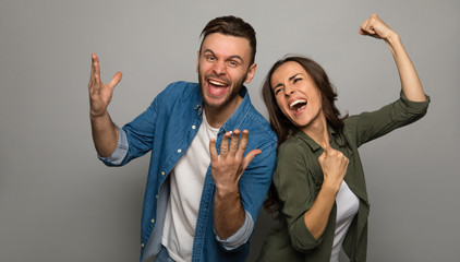 Our family wins. Close-up photo of an overjoyed man in a denim shirt and excited girl in a casual outfit, who are expressing feelings of success and holding their hands in fists.