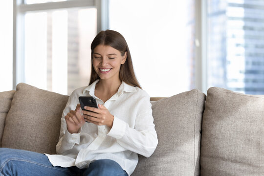 Cheerful beautiful millennial 20s girl typing on cellphone, sitting on home couch in city apartment, enjoying online Internet communication, touching screen, using financial ecommerce app