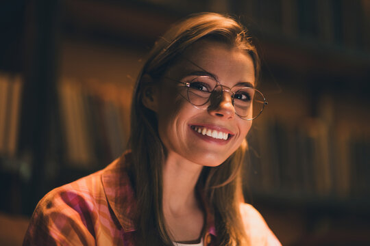 Photo of lovely young blonde lady cheerful toothy smile dressed plaid shirt study dark comfortable coworking university library interior