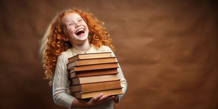 In a charming library filled with books, a cheerful child with curly hair and braces beams with happiness and intelligence, radiating confidence and joy