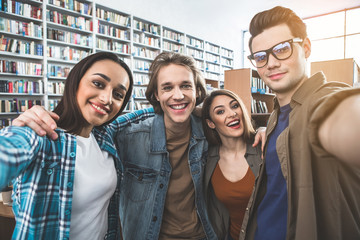 Portrait of beaming males and happy women embracing each other during study in athenaeum. They taking selfie