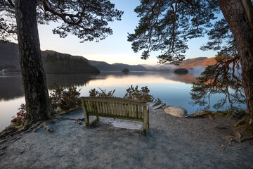Lonely wooden bench overlooking misty lake with falling snow and evergreen reflection
