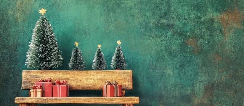 Wooden bench adorned with gifts and decorative toy fir trees against a vibrant green background for festive holiday ambiance