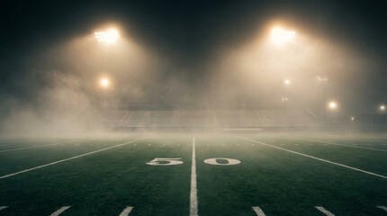 Empty American football field at night with stadium lights and fog creating an atmospheric and dramatic scene.