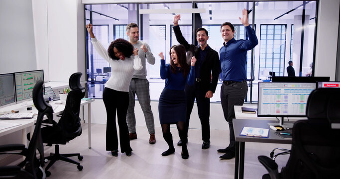 Team celebrates success in office during work hours with hands raised