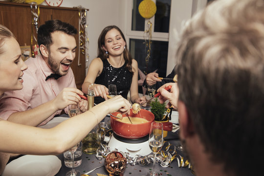 Friends eating cheese fondue on New Year's Eve