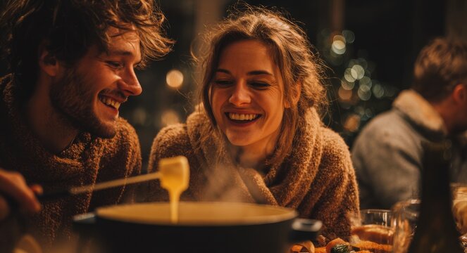 Delicious cheese pull from a fondue pot, captured in a warmly lit setting, epitomizing comfort food.