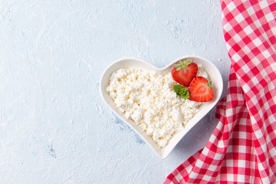Cottage cheese with fresh strawberry and mint leaves in a heart shaped bowl, healthy breakfast concept, top view
