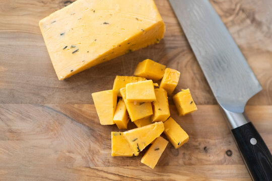Top view of a knife resting on a wooden cutting board with chunks of English cheddar cheese