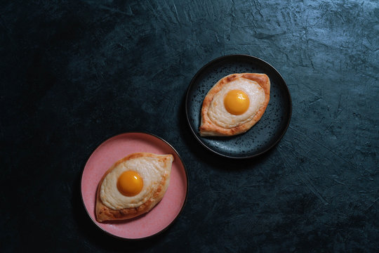 Two Adjarian khachapuri on a pink and black plate on a dark background.
