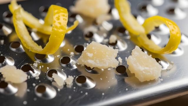 Freshly grated lemon zest curls and finely shredded cheese resting on a shiny metal kitchen grater.