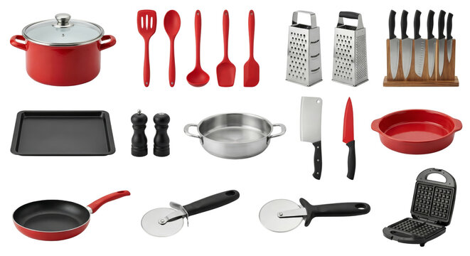 Comprehensive collection of kitchen utensils and cookware isolated on transparent background