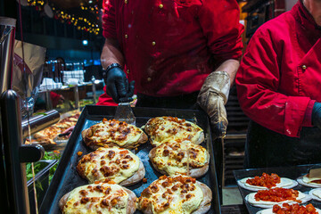 Hot cheesy flatbreads steaming in a tray while a vendor in gloves prepares more dough rounds topped with chopped tomato and slices of cheese. Festive street food preparation