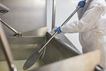 An expert cheesemaker at work. Dairy, cheese