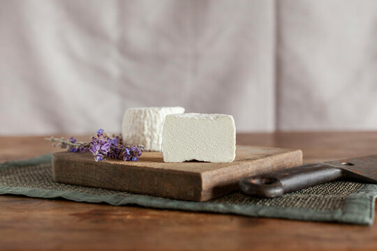 Artisan cheese wheels displayed on a wooden counter, showcasing their rustic texture and creamy interior, perfect for gourmet enthusiasts