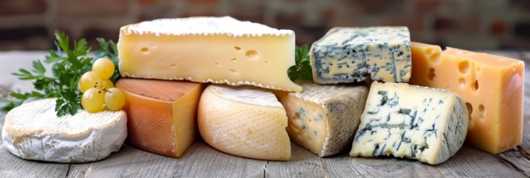 Assortment of Delicious Cheeses A Variety of Textures and Flavors on a Rustic Wooden Table