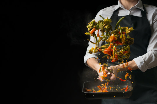 Chef skillfully tossing sliced vegetables in professional kitchen
