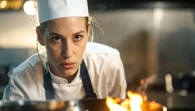 Determined young female chef intensely focused on cooking over an open flame in a professional kitchen setting