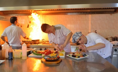 Professional chefs preparing dishes in restaurant kitchen