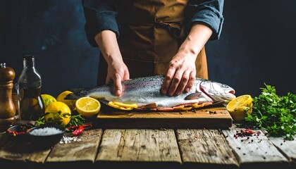 Chef Preparing Fresh Fish With Vegetables In Rustic Kitchen Images