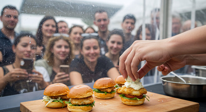 Delicious fish sliders cooking demonstration food presentation chef preparing gourmet burgers street food event