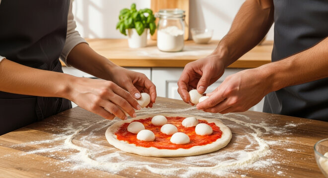 Two people putting mozzarella cheese balls on a pizza base with tomato sauce in a modern kitchen