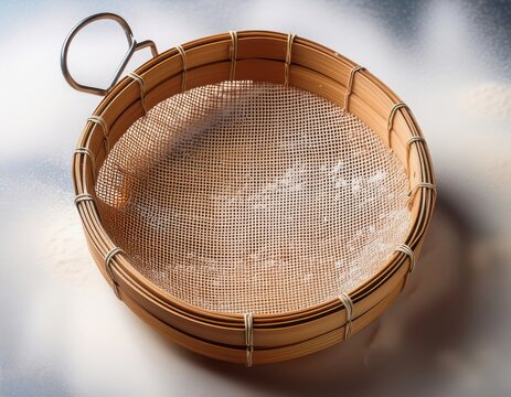 Sieve with the flour in the bowl on the old wooden table in the kitchen. Healthy eating and lifestyle.