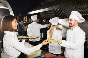 The chef in restaurant kitchen finishes the food ready for delivery in takeaway packages