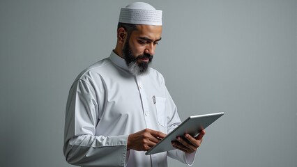 PNG studio shot of a mature man using a digital tablet against a grey background. Arabic style. Muslim businessman.