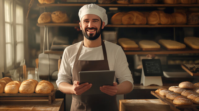 Experienced baker using a tablet in the bakery to manage recipes or inventory in a rustic setting.