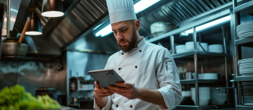 Professional chef using tablet for culinary management in kitchen