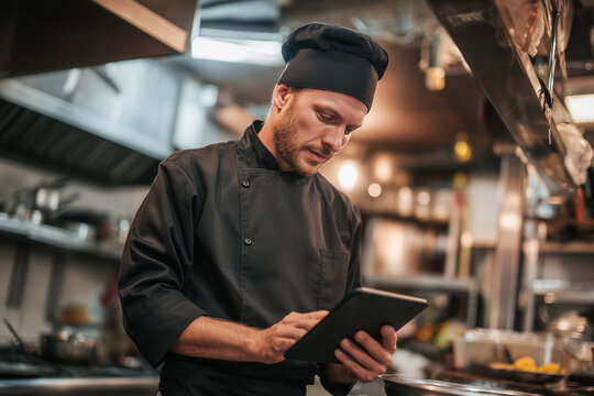 Chef Utilizing Tablet Technology In Restaurant Kitchen Images