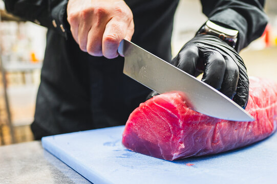 A person in black attire with black gloves slices a large piece of tuna on a blue cutting board using a large chef’s knife