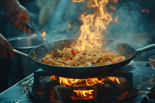 Chef cooking pad thai in a large pan kitchen culinary action intense environment close-up flavorful experience