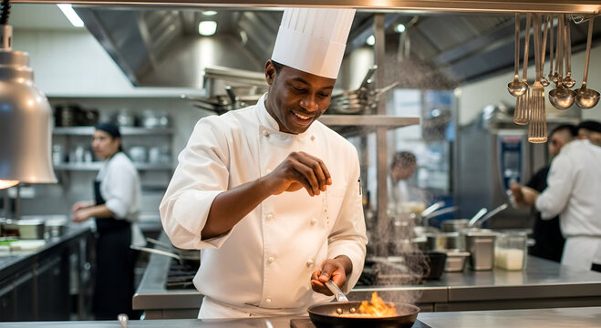 Team of Black male and African American female chefs in white uniforms cooking together, woman stirring food, teamwork in kitchen.
