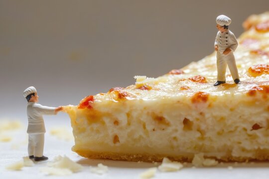 Miniature chefs interacting with a large slice of cheesy pizza.