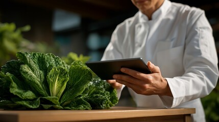 Close-up of chef scanning produce with smart device while interacting with digital farm analytics, highlighting agri-tech innovation, farm-to-table freshness, and futuristic culinary sourcing.