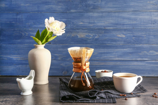 Tasty coffee in chemex on dark table