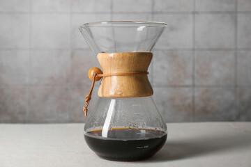 Glass chemex coffeemaker with tasty drip coffee on white table