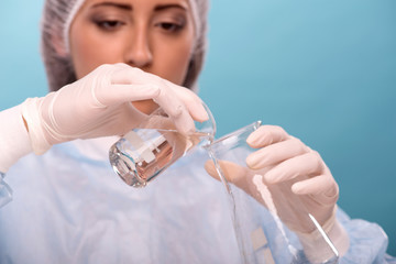 Scientist analyzing and dropping a sample into a glassware.
