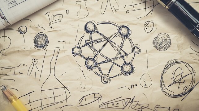 Hand drawn chemistry notes doodles of atoms formulas on paper academic science sketch style textbook concept artwork