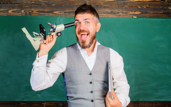 Smiling male teacher or student with laptop and microscope in classroom. University professor in chemistry or biology class with notebook and microscope. E-learning, technology, scientific, research.
