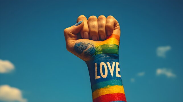 Against the background of a blue sky with clouds, a hand painted in rainbow colors is raised in a fist with the inscription "LOVE". The movement for LGBT equality and the concept of gender equality.