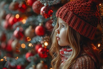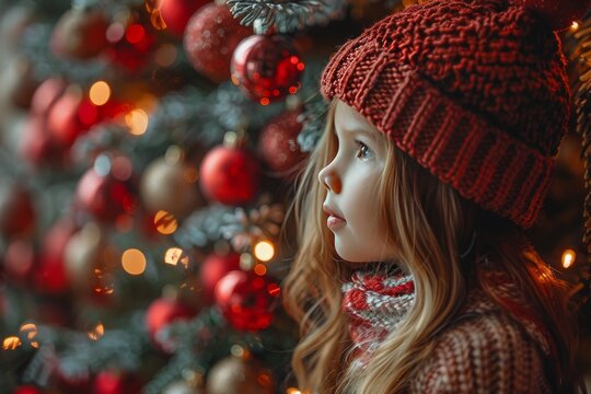 Young girl in santa hat joyfully decorating christmas tree with red ornaments as family tradition
