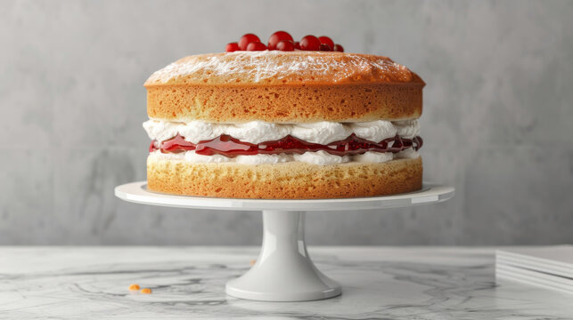 Decadent chocolate walnut brownies with cherries and whipped cream on glass cake stand