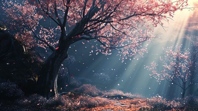 A serene and picturesque scene featuring cherry blossom trees in full bloom. The setting appears to be early morning with ethereal sunbeams penetrating the mist, casting a soft, magical light througho