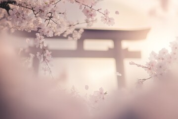 Elegant Cherry Blossoms Surrounding Torii Gate in Soft Morning Light - Tranquil Japanese Spring Landscape Photography