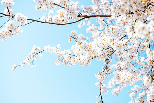 Blooming white cherry blossoms against bright blue sky
